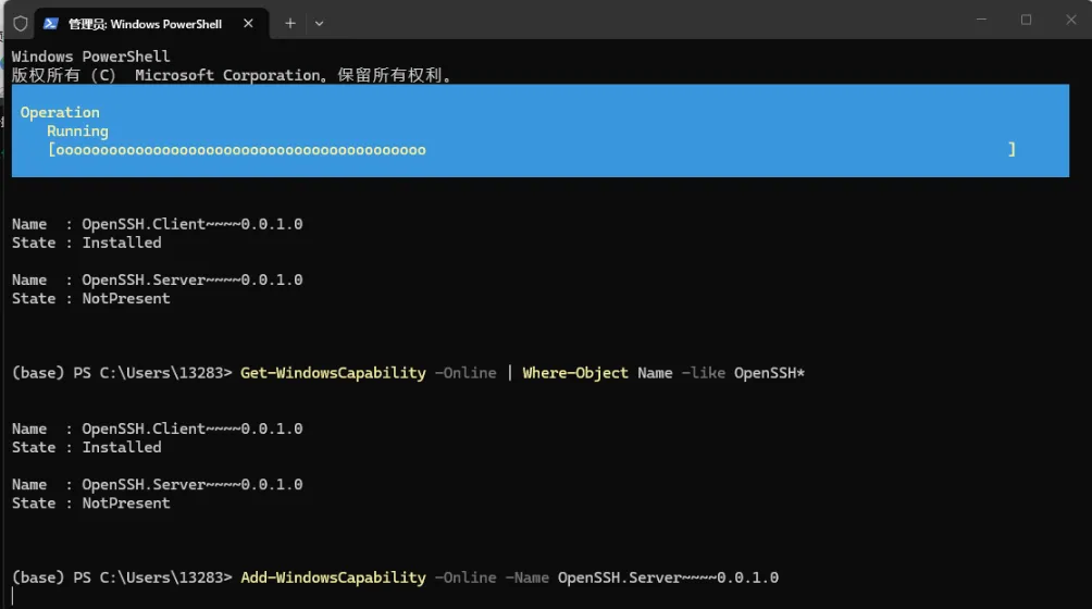 (base) PS C:\Users\13283> Get-WindowsCapability -Online | Where-Object Name -like OpenSSH*Name : OpenSSH.Client~~~~0.0.1.0State : InstalledName : OpenSSH.Server~~~~0.0.1.0State : NotPresent提示安装了OpenSSH.Client,但是没有OpenSSH.Server。