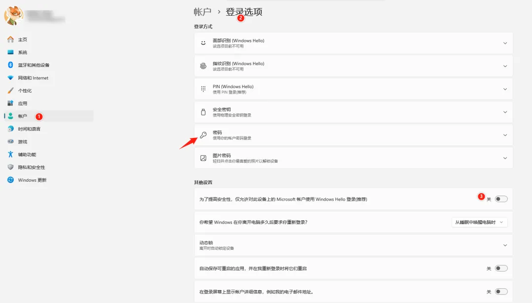 关于找不到自己笔记本电脑的开机密码的解决办法:win+I,打开设置,账户,登录选项,关闭Windows Hello。