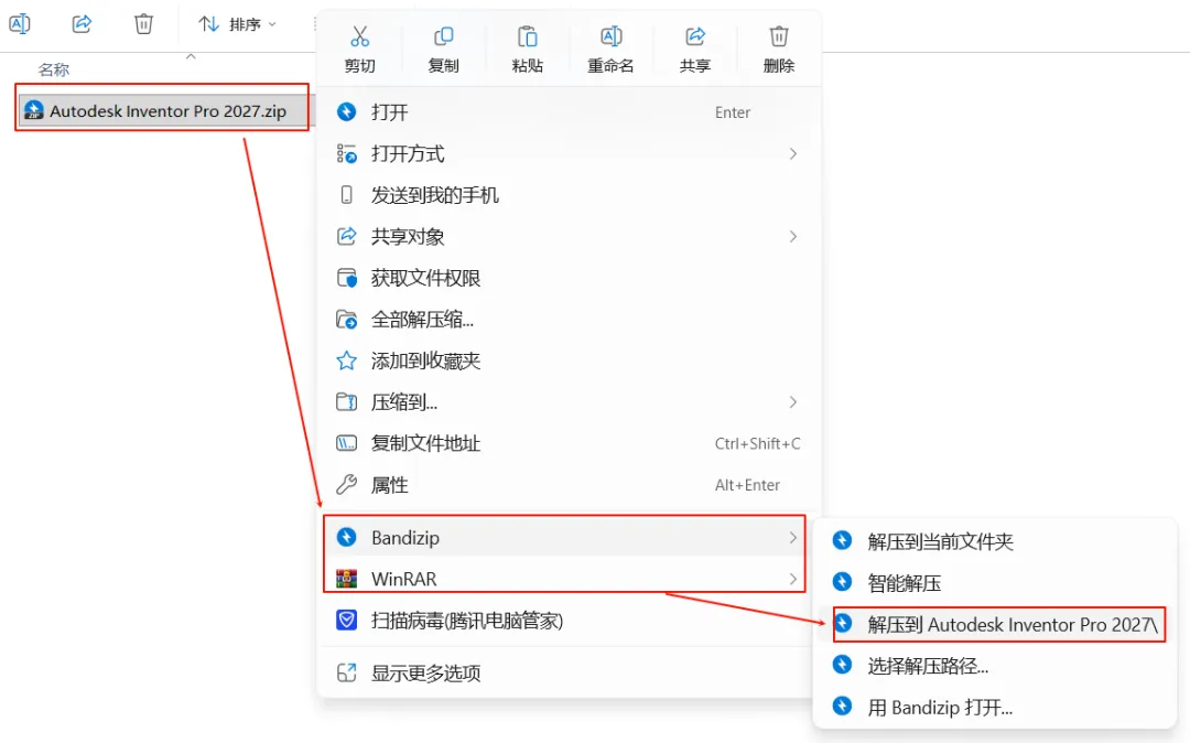 1.选中下载好的安装包,鼠标右键解压到“Autodesk Inventor Pro 2027”文件夹