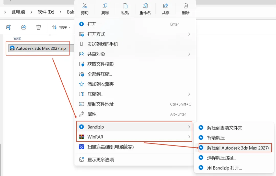 1.选中下载好的安装包,鼠标右键解压到“Autodesk 3ds Max 2027”文件夹