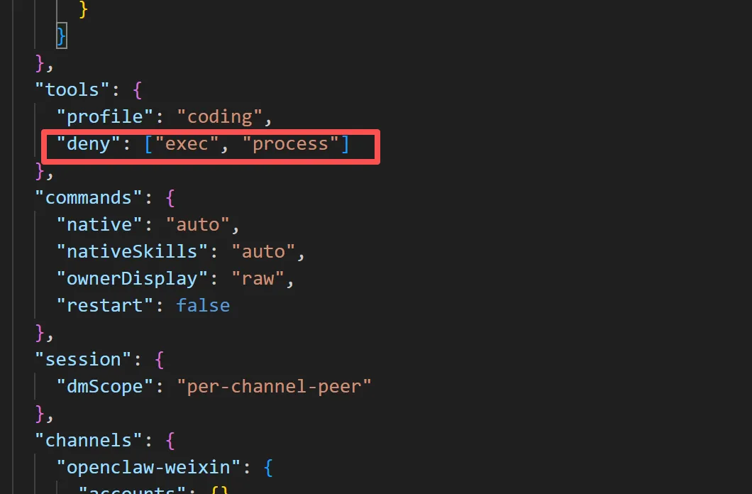 在 OpenClaw 配置文件(openclaw.json 或 config.yaml)中,将 exec 加入 deny 列表: