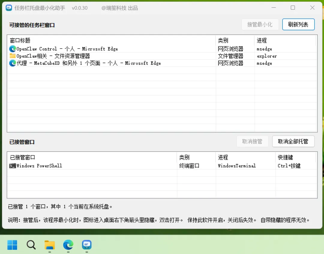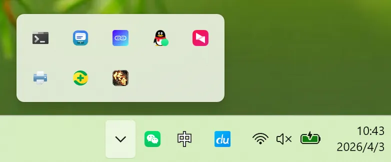 什么意思?就是像 OpenClaw 这种需要长期挂着、但你又不想它一直明晃晃显示在任务栏上的程序,可以直接缩到右下角箭头里面去。程序还在正常运行,但任务栏立刻清爽很多,桌面看起来也干净不少。
