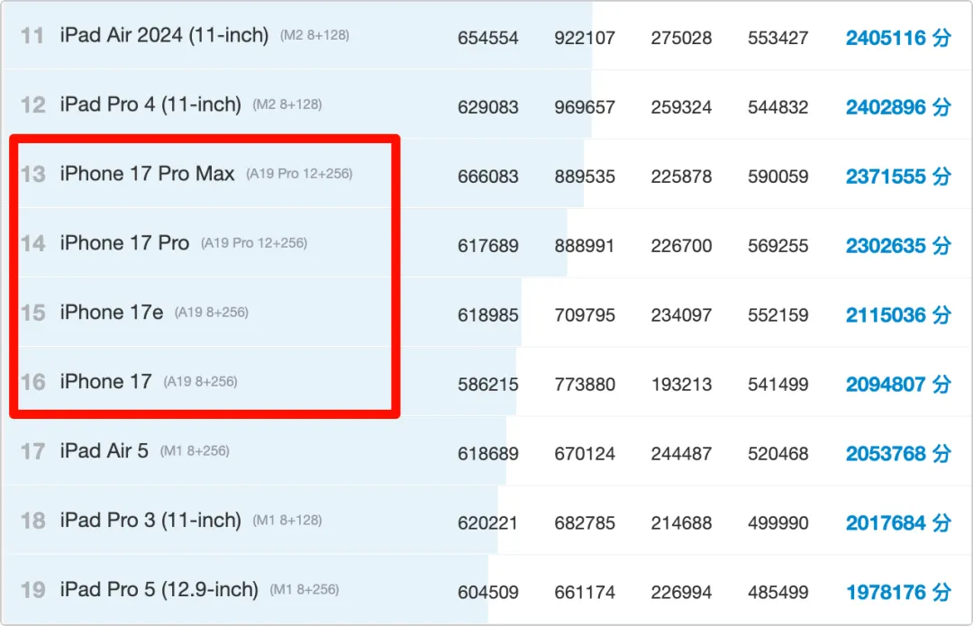 由于 iOS 和 iPad OS 属于同一套系统,所以不管是国内还是国外,这两者的跑分都是排在一起的
