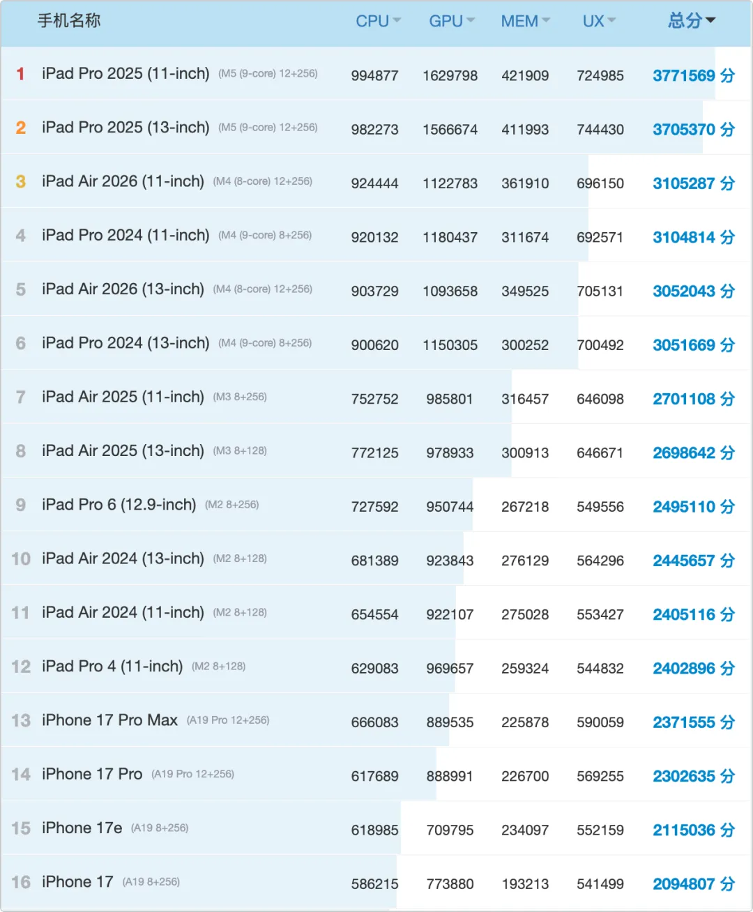 上个月,苹果发布了众多新品,包括 iPhone 17e、iPad Air M4 等,iOS机型的性能排名也发生变动。