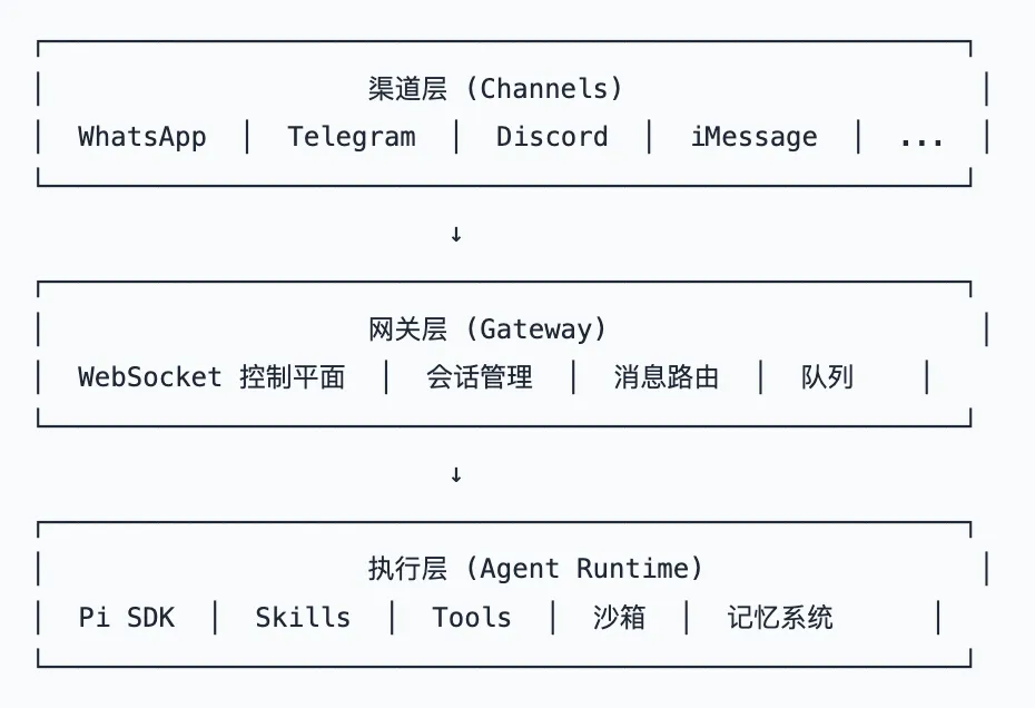 sequenceDiagramparticipant Channelparticipant Gatewayparticipant Agentparticipant ToolsChannel->>Gateway: 消息到达Gateway->>Gateway: 入队 (Session Lane)Gateway->>Agent: 创建会话 + 注入上下文Agent->>Agent: 构建系统提示 (Skills + Bootstrap)Agent->>Agent: 调用 LLMAgent->>Tools: 执行工具 (exec/read/browser...)Tools-->>Agent: 返回结果Agent-->>Gateway: 流式输出 (assistant/tool 事件)Gateway-->>Channel: 回复消息Gateway->>Gateway: 持久化会话 (JSONL)