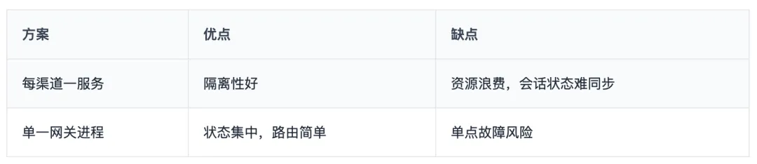 设计决策:一个 Gateway 进程管理所有渠道连接,而不是每个渠道一个服务。