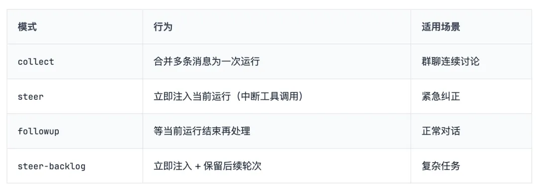 // Session Lane:每会话一个队列,保证串行// Global Lane:所有会话共享,控制并发上限// 配置示例{agents: {defaults: {maxConcurrent: 4 // 最多 4 个会话并行执行}},messages: {queue: {mode: "collect", // 合并多条消息为一次运行debounceMs: 1000, // 等待 1 秒静默期cap: 20, // 最多排队 20 条drop: "summarize" // 溢出时生成摘要}}}