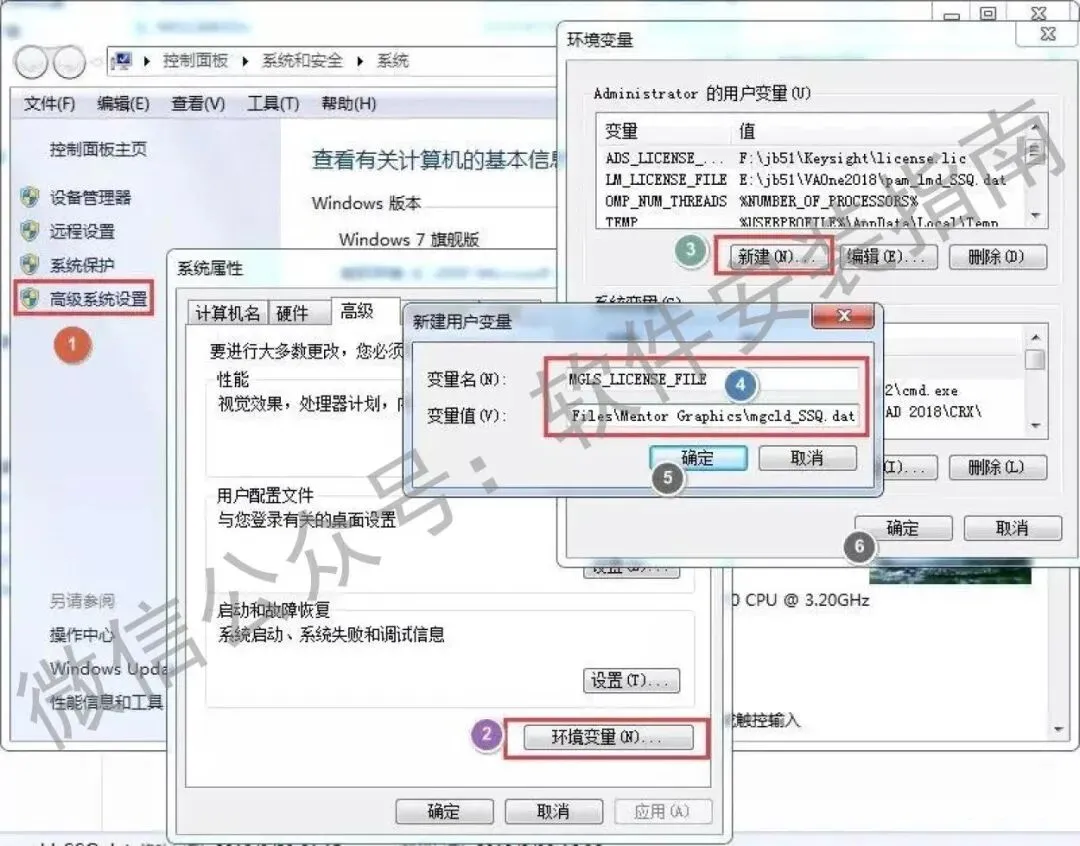 18.创建环境变量找到计算机或我的电脑,右击图标——>属性——>高级系统设置——>环境变量——>新建变量名:MGLS_LICENSE_FILE变量值:mgcld_SSQ.dat文件的路径(如果是目录的路径,那么就是:C:\Program Files\Mentor Graphics\mgcld_SSQ.dat )