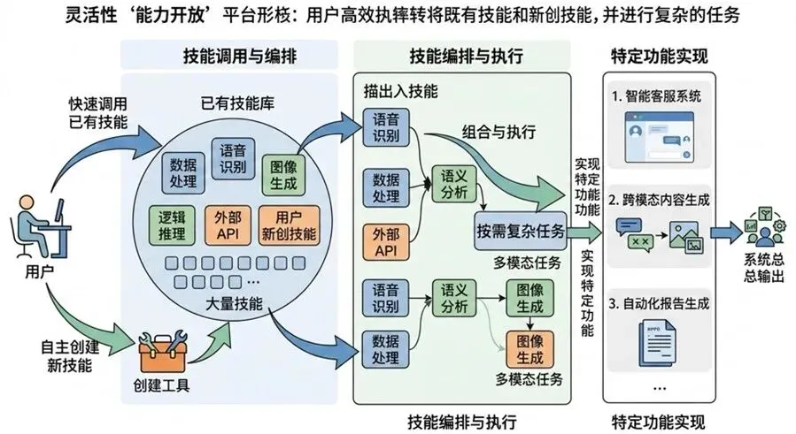 能力开放,用户能够快速调用已有技能(skill)或创建新的技能,自主地完成特定功能。