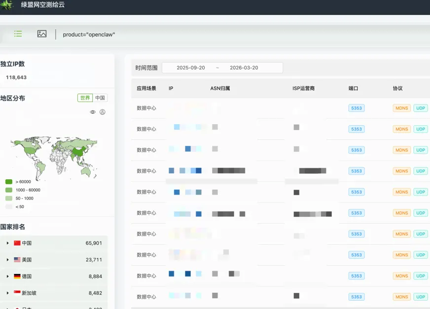 2026年3月20日,网络空间测绘系统Shodan显示监听互联网上国内暴露的OpenClaw服务为6.8万(指纹提取自18789端口banner),绿盟威胁情报显示国内OpenClaw服务暴露数量为6.5万余(指纹提取自5353端口banner),如图3所示(注:Shodan中18789端口暴露数总数为24.7万,但具体产品之和远少于总数,可能原因是Shodan产品识别不够精确,故取暴露数量而非已识别的产品数量)。
