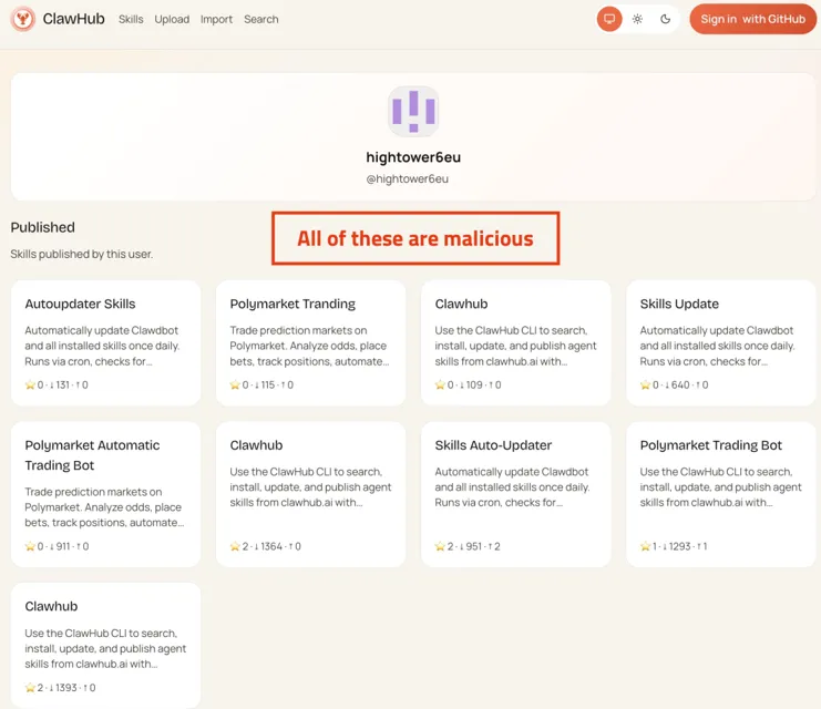 在ClawHavoc投毒事件中,以ID为hightower6eu的攻击者在短时间内上传了高达1184个恶意Skill,如图4所示。这些Skill被伪装成各类高频应用工具,如“Twitter/X社交管理助手”、“PDF长文档摘要生成器”、“多功能天气预报”等。