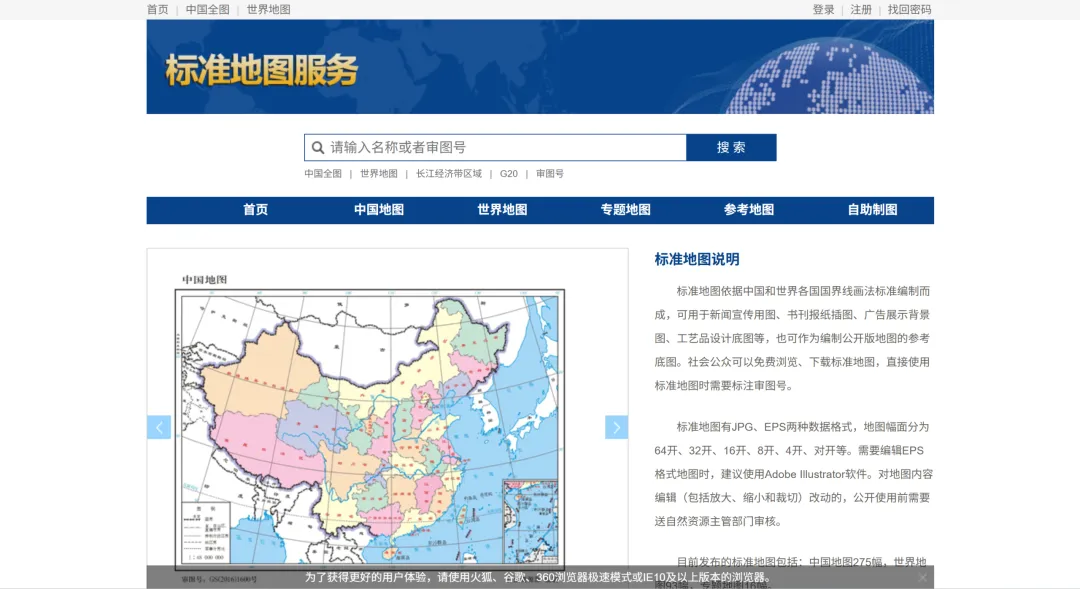 目前发布的标准地图包括中国地图249幅、世界地图79幅、专题地图10幅,提供JPG、EPS两种数据格式,可以免费浏览和下载。