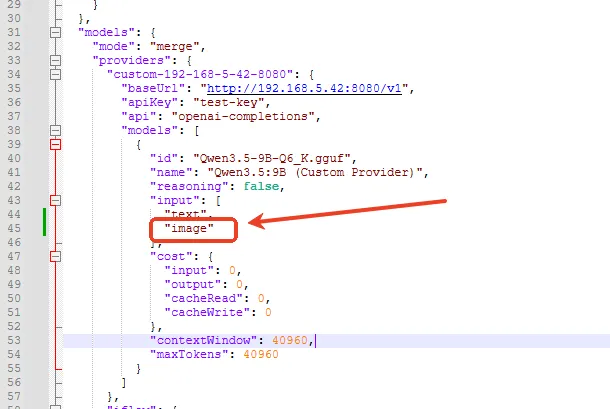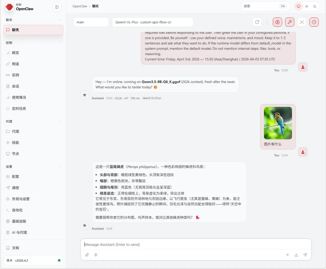在OpenClaw配置文件"openclaw.json"中找到模型 models 中 Qwen3.5-9B 字段中的 input中添加 "image" 选项后重启 OpenClaw