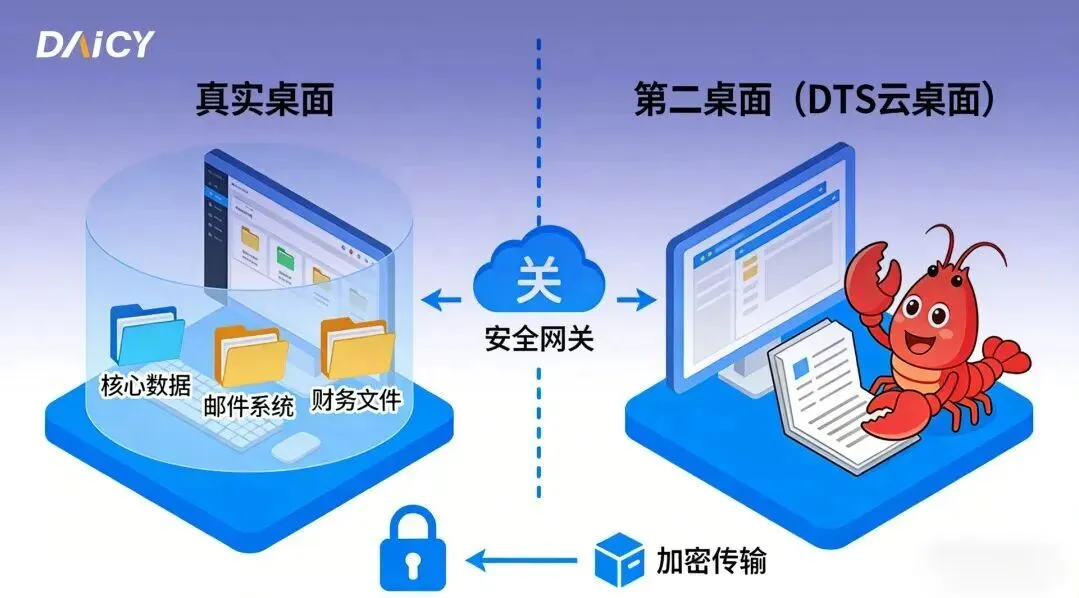 过去一年,OpenClaw(昵称“小龙虾”)在全球开发者社区迅速走红。这款开源的AI智能体网关,与传统的对话机器人截然不同——它不仅能回答问题,还能真正执行操作:读写文件、启动程序、发送消息、处理数据……一句话,它能像人一样“干活”。然而,这种能力也带来了前所未有的安全挑战。当智能体拥有系统级执行权限时,任何一次“AI越界”都可能引发严重的数据泄露或业务中断。这正是很多企业虽然看好AI自动化,却迟迟不敢落地的根本原因。核心矛盾在于:AI需要足够的权限才能创造价值,但权限本身又是风险的来源。那么,有没有一种方式,既能让AI发挥全部能力,又能将风险牢牢锁在可控范围内?戴西DTS 3D远程可视化云桌面提供了一种全新的解决方案——让OpenClaw这类AI智能体运行在云端隔离的虚拟桌面中,与用户的真实物理工作环境完全隔绝。这个虚拟桌面,就是员工的“第二桌面”。所有AI操作、数据读写、文件处理,全部发生在这个安全沙箱环境里。即使AI“调皮”了,也影响不到本地真实数据和核心业务系统。