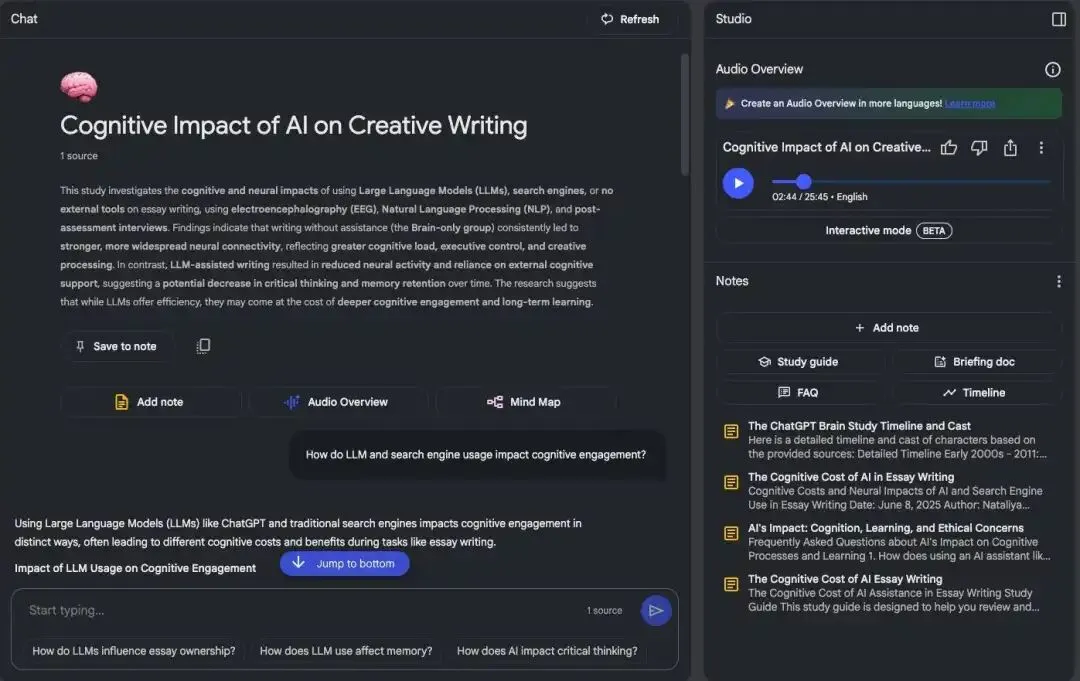 我最近在研究一个新技术方向,上传了5份白皮书和3个技术文档。NotebookLM不仅帮我提炼出核心观点,还生成了一个“播客式”的音频总结,我通勤路上听完,基本就掌握了七八成。