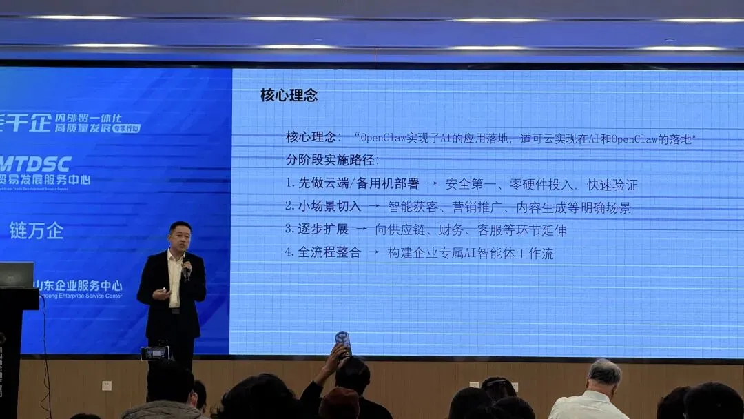 在主题演讲环节,道可云总经理孙即林以《从VR验厂到OpenClaw数字员工:外贸企业AI升级实战》为题,系统阐述了OpenClaw技术在外贸场景中的深度应用与实战路径。