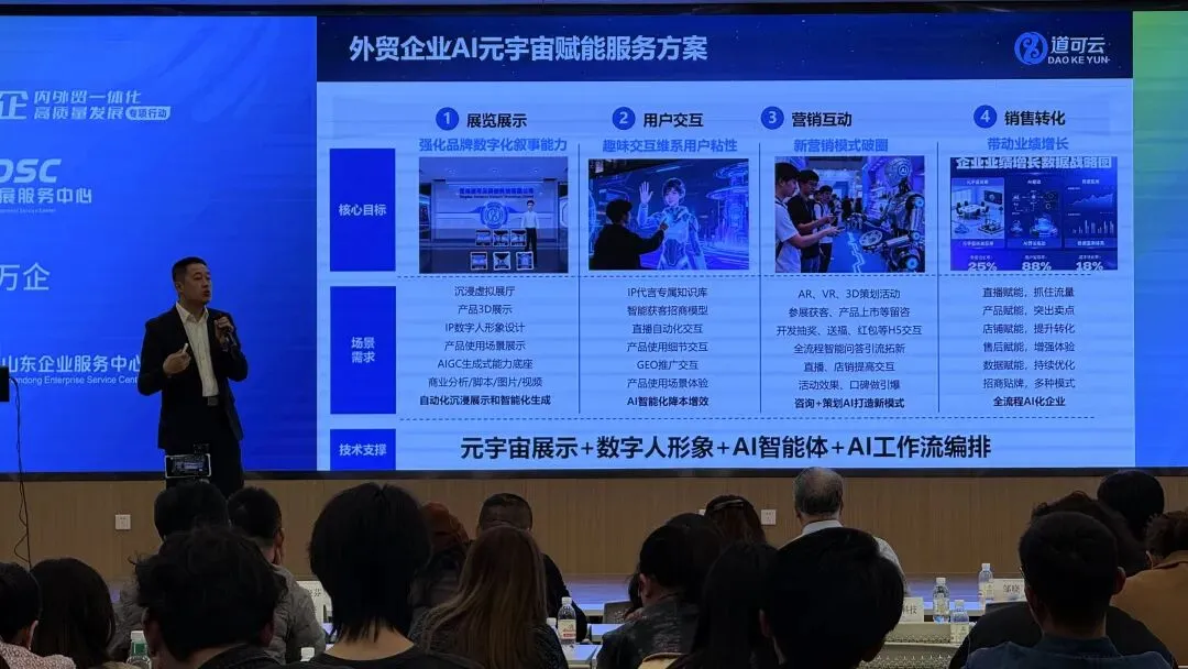 在技术与服务能力方面,孙即林现场介绍,道可云作为工信部推荐数字化赋能平台企业,深耕 AI 智能体、VR、元宇宙、数字人系统研发,自主搭建AI与元宇宙融合应用体系,具备成熟的企业级 AI 落地资质与技术实力,已在政务、文旅、制造业及跨境贸易等多个领域实现规模化应用,并具备完善的项目交付与安全保障能力,为企业提供从咨询规划到部署落地的一体化解决方案。