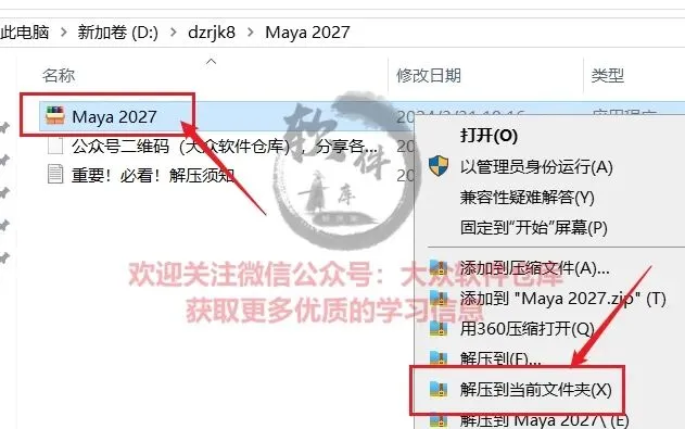 1.把资源从网盘下载到电脑上面,右键Maya 2027.exe压缩包选择解压到当前文件夹;