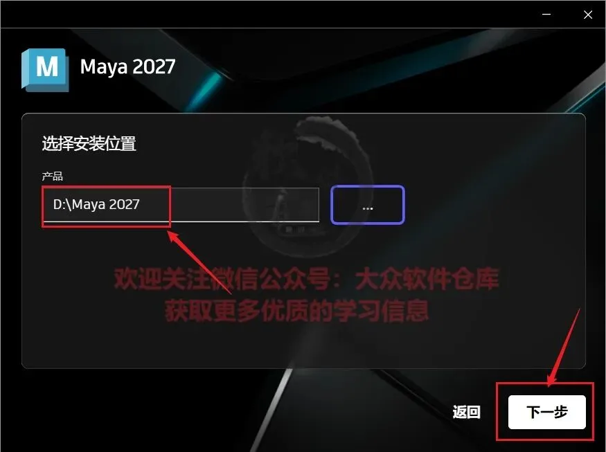 6.建议自己在D盘新建一个Maya 2027的文件夹,然后将软件安装在该目录,修改好位置后点击下一步;
