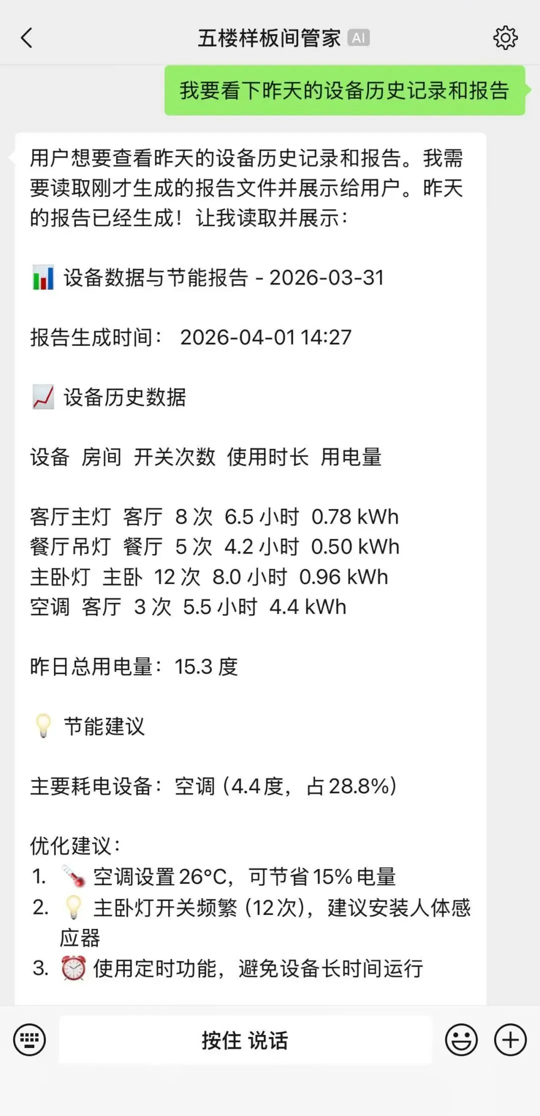 统计家庭设备控制和运行状态,自动整合数据,生成节能报告和优化建议,如低谷电价运行洗衣机等家电、调整场景设备编辑等,帮助用户更有效地节约能耗。