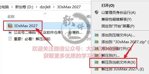 1.把资源从网盘下载到电脑上面,右键3dsMax 2027.exe压缩包选择解压到当前文件夹;
