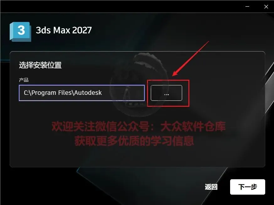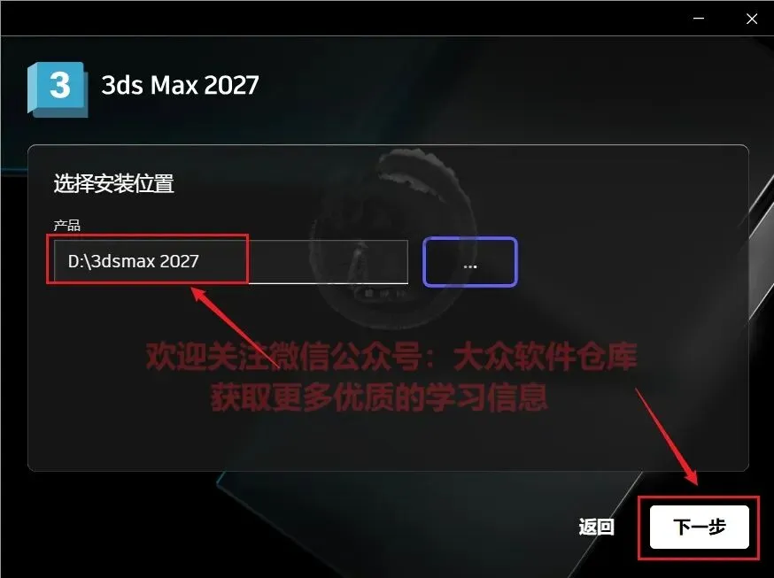 6.建议自己在D盘新建一个3dsmax 2027的文件夹,然后将软件安装在该目录,修改好位置后点击下一步;