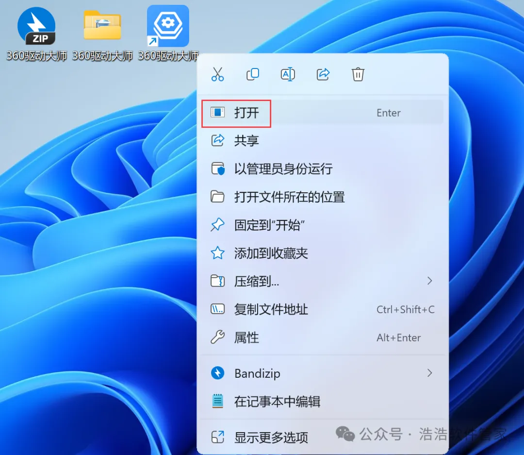 7、回到桌面,右键桌面上的【360驱动大师软件图标】,点击【打开】