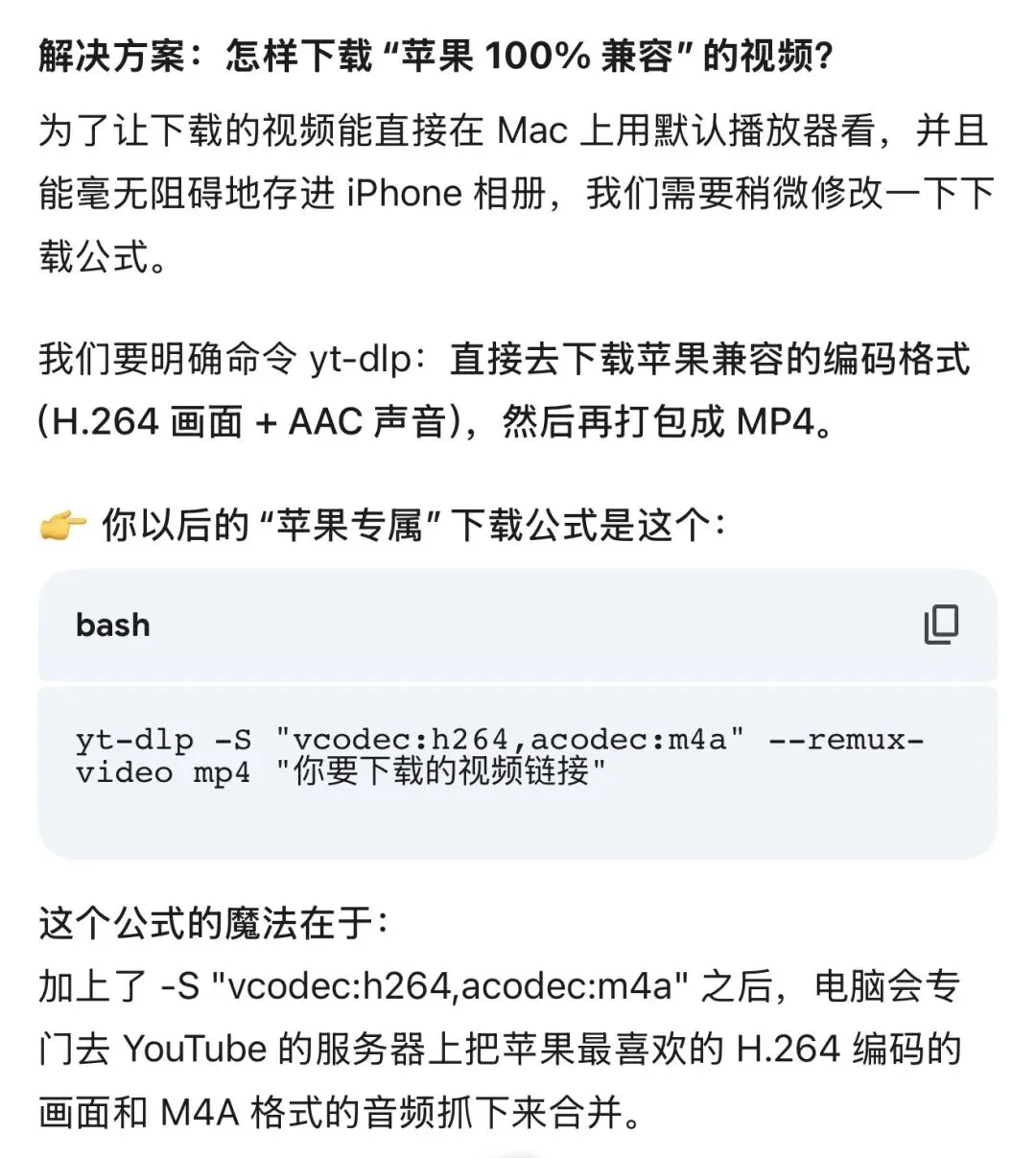 另一个方法,是Gemini教我的,我昨晚上按照Gemini的步骤操作了一下,也遇到了一些问题(比如下载下来的视频格式是WebM不是MP4,但换成了MP4,又发现隔空投送到苹果手机无法存入相册,只能存到文件),都发给Gemini让它修改了,最后测试了一个视频,终于成功,有待更多下载测试。