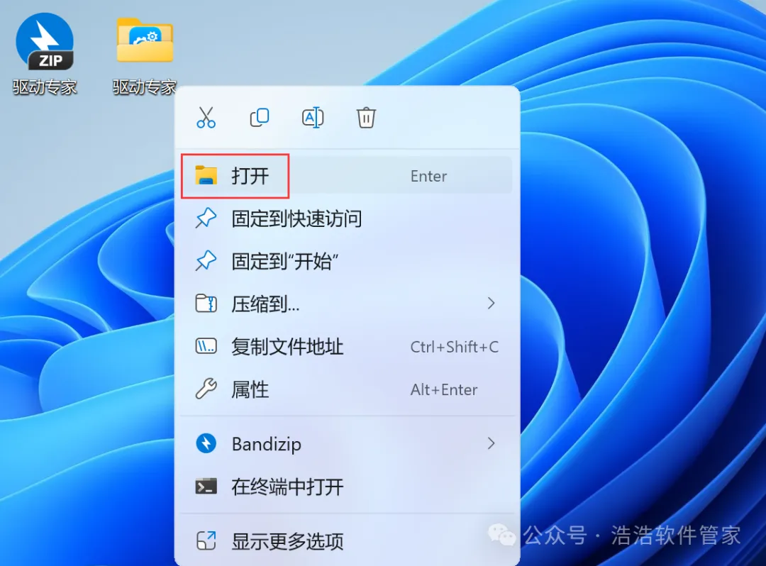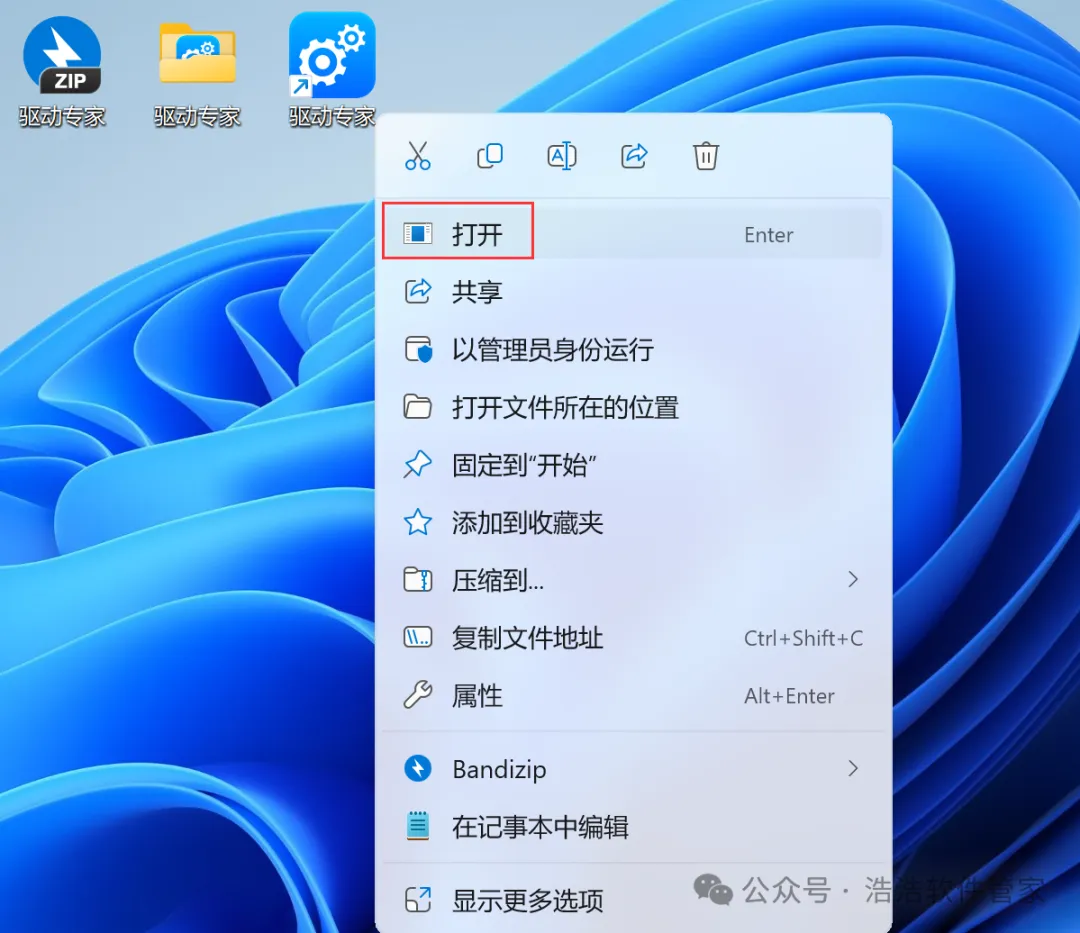7、回到桌面,右键桌面上的【驱动专家软件图标】,点击【打开】