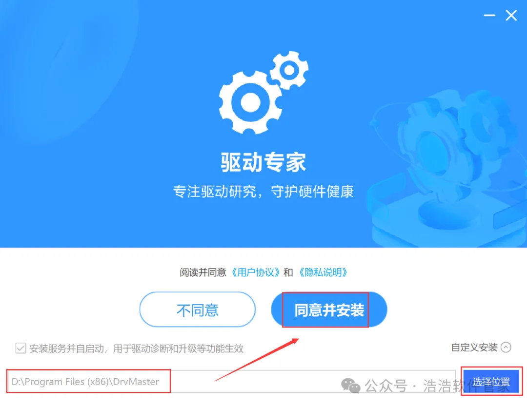 5、软件默认安装在C盘,可自定义更改软件安装位置,这里小编选择安装在D盘;点击【同意并安装】
