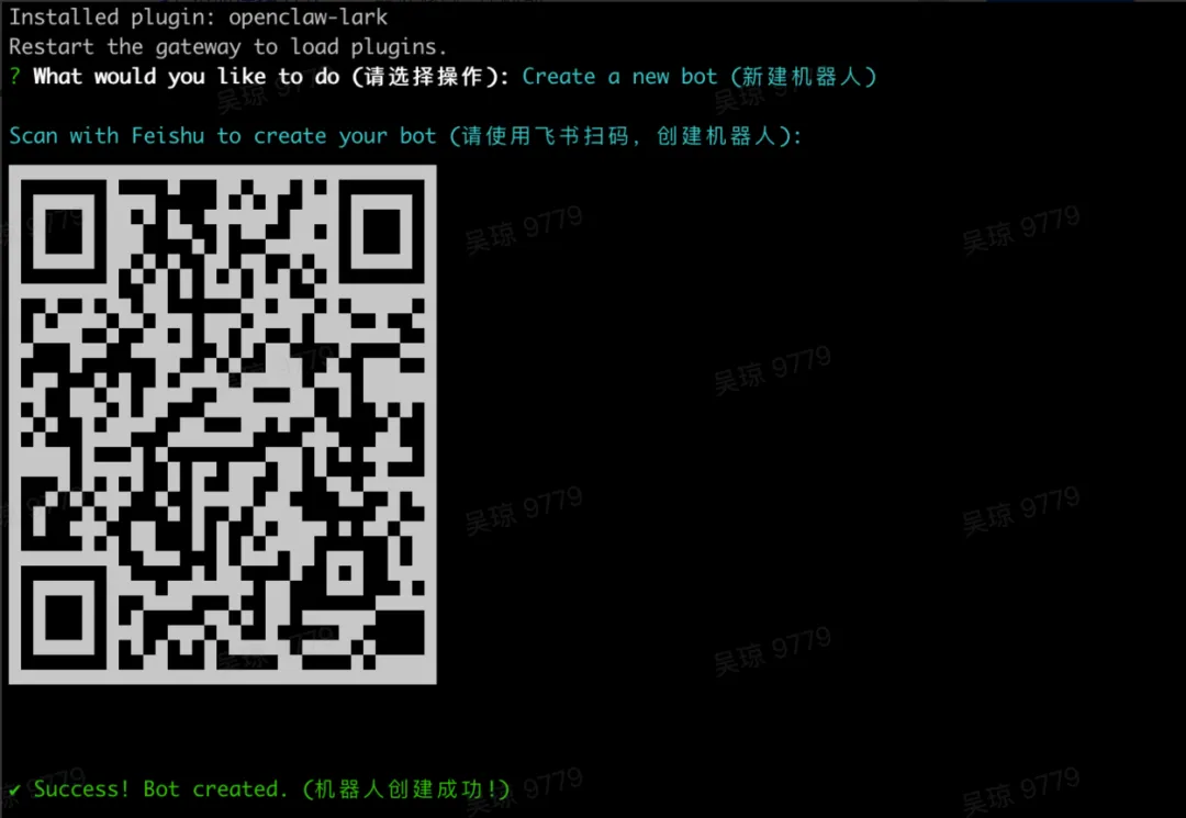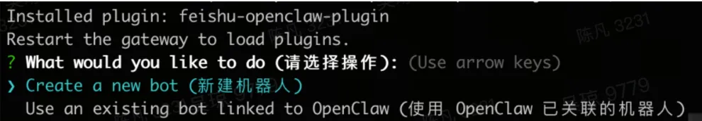 npm install -g openclaw@latest --registry=https://registry.npmmirror.comopenclaw -vnpx -y @larksuite/openclaw-lark install执行过程中,可选择新建机器人或关联已有机器人。