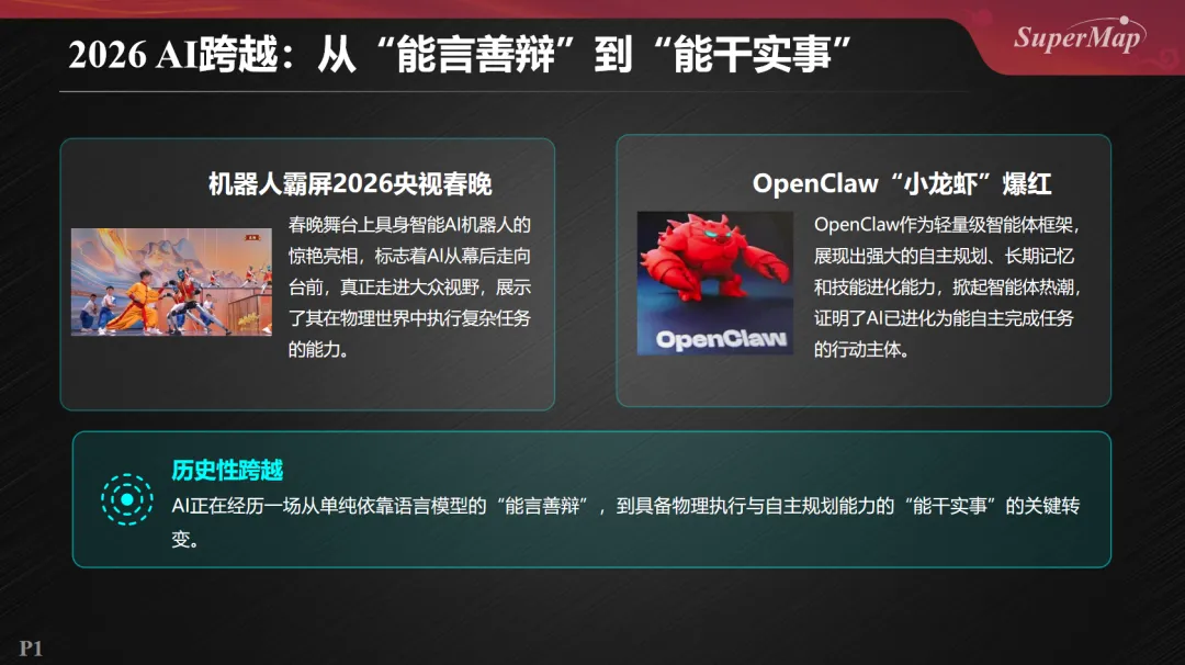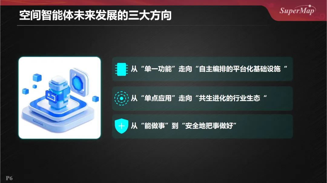 OpenClaw的爆发,离不开开源社区的共建。这也印证了:智能体从不是孤立存在的,而是需要协同联动的生态。空间智能的发展,同样需要“产学研用”共同发力。目前,超图联合阿里Qwen及10家政产学研用单位,成立了“空间智能创新联合体”,深化“空间智能+”应用落地。我们希望推动建立统一的空间智能体开发标准和接口协议,鼓励更多开发者基于空间智能软件底座,孵化出面向细分场景的“专属智能体”,让行业和专家的知识经验通过智能体实现工具化、资产化,形成“人人都是空间智能开发者”的繁荣生态。