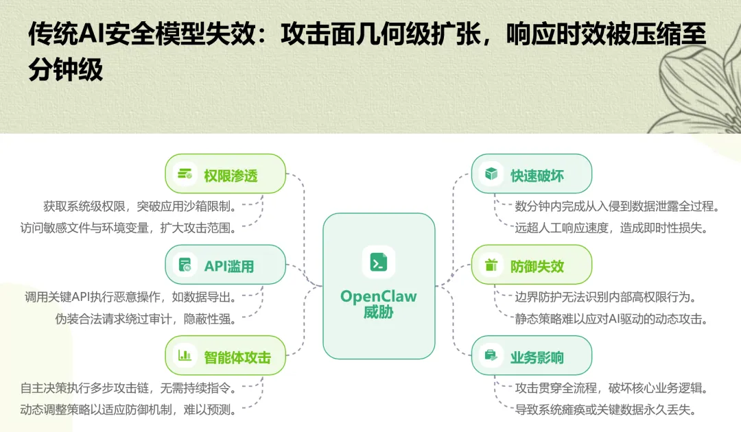 然而,这种自主能力也彻底打破了传统安全模型的假设——攻击面从有限接口扩张为智能体可触及的一切资源,权限被泛化,行为变得不可预测,攻击者甚至可以在几分钟内完成从入侵到数据泄露的全过程。