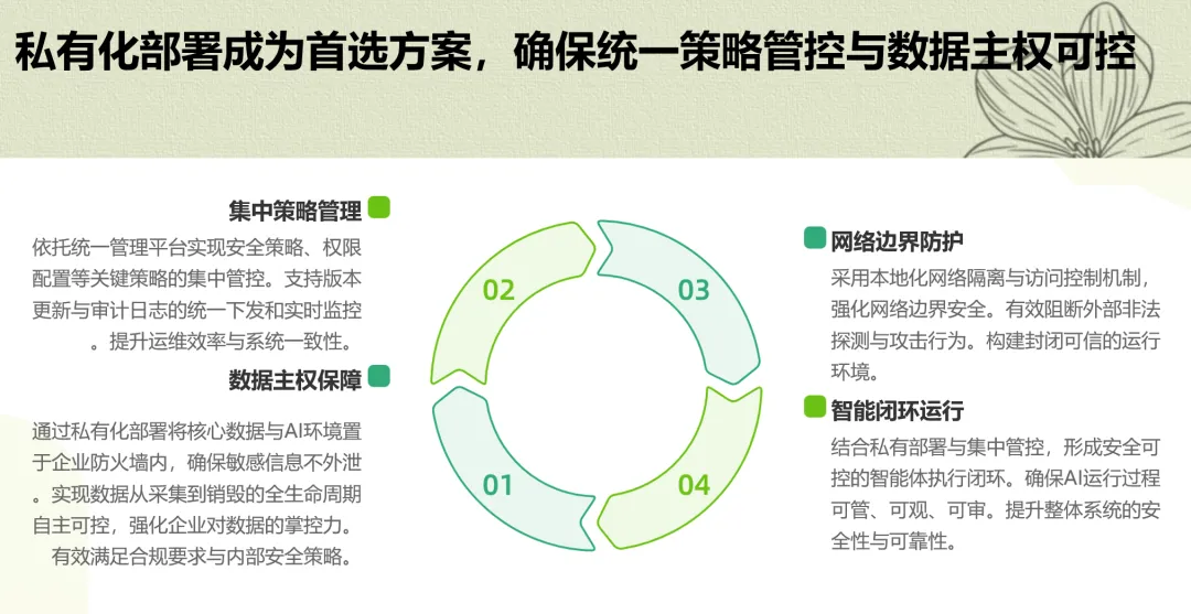 第二个重点是私有化部署成为数据主权的必然选择。PPT详细对比了不同部署模式的风险等级,明确指出对于核心业务系统,私有化部署是首选方案。其核心价值在于将智能体运行环境、企业数据以及AI交互流量全部置于防火墙内部,确保敏感信息从采集到销毁的全生命周期不出域。