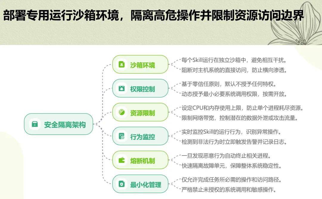 更隐蔽的是,供应链污染还可能通过自研Skill依赖的底层库传播,形成连锁感染。为此,PPT提出了一套强制性的准入机制:所有Skill必须经过数字签名验证以确保来源可信,再通过静态代码扫描识别高危API调用和硬编码密钥,最后在动态沙箱中模拟运行以发现隐蔽后门和异常通信。