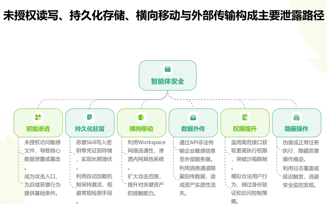 第四个重点是Workspace数据空间的防泄露体系。PPT将Workspace定义为智能体处理企业数据的核心容器,并剖析了四类典型风险:未授权读写、持久化存储、横向移动和外部传输。