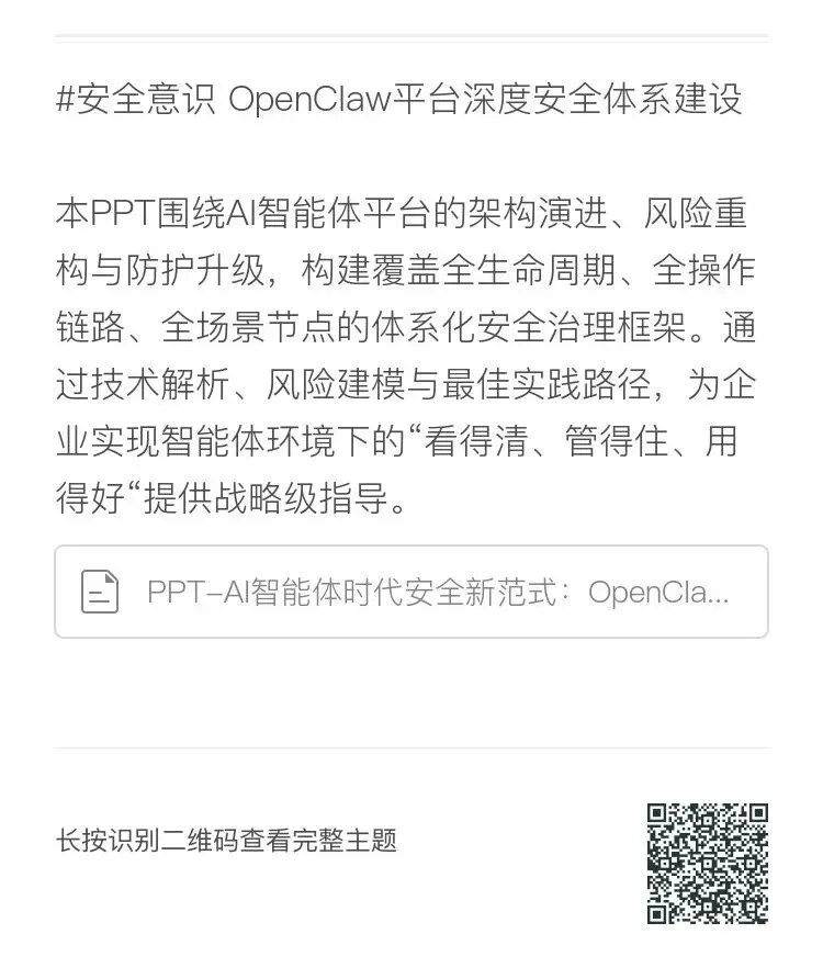 这份PPT以OpenClaw平台为切入点,系统性地探讨了AI智能体时代企业安全体系如何从传统防御范式向动态、全域、实时的新范式跃迁。我们从中提炼了六个核心要点,以方便读者了解。