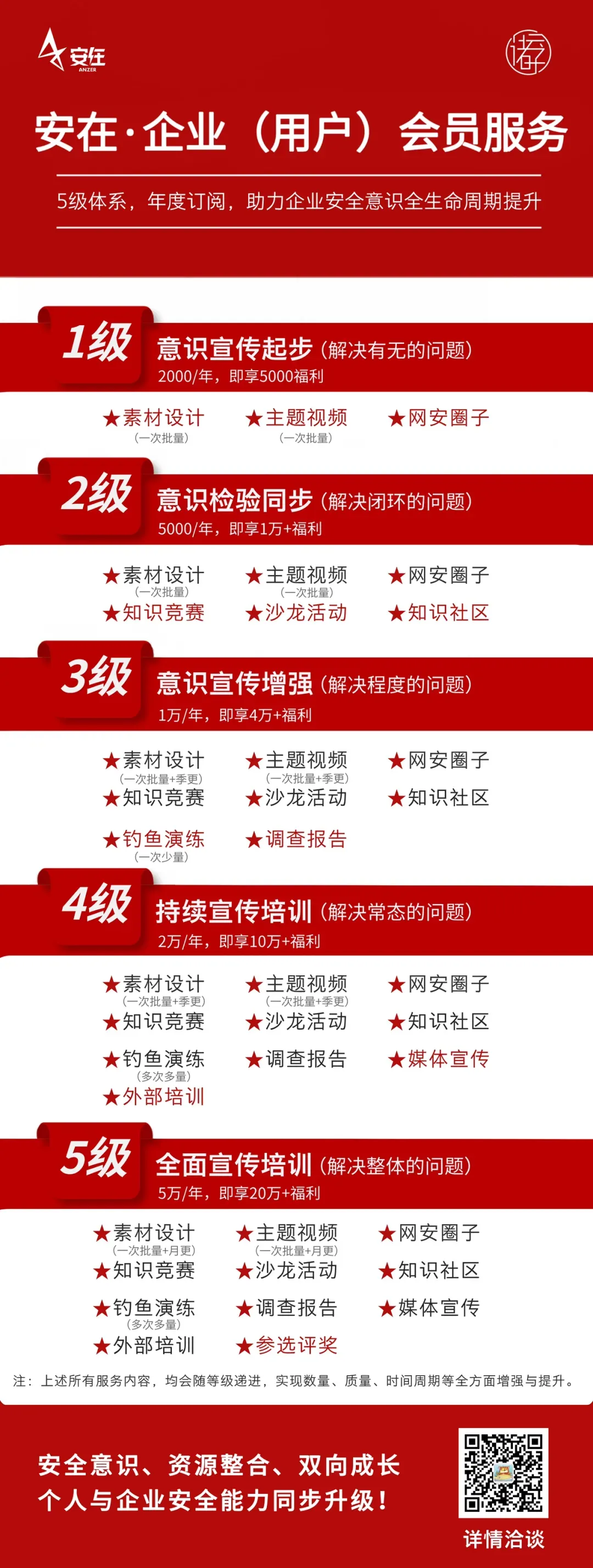 深度贴合企业不同规模、安全水平投入以及员工安全意识的不同发展阶段,特设5级安全意识培训服务体系,为企业用户量身匹配适配的安全意识解决方案。