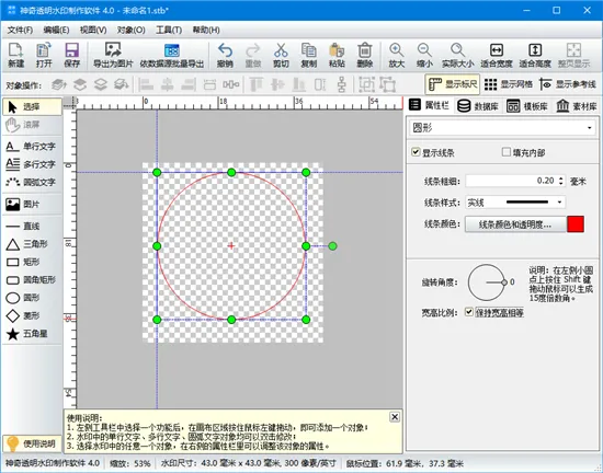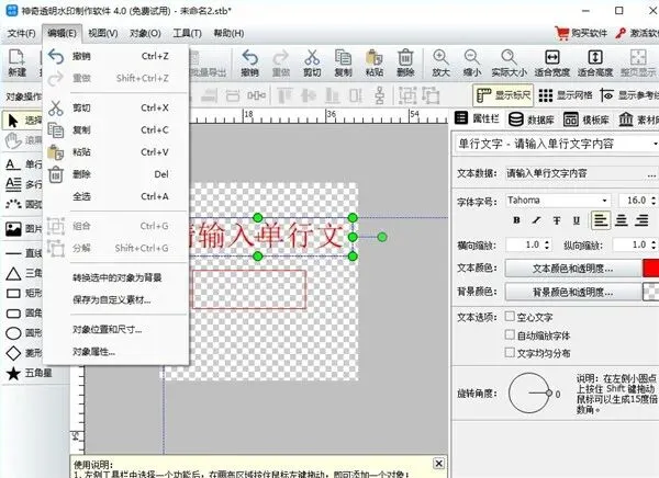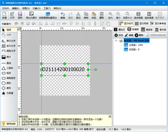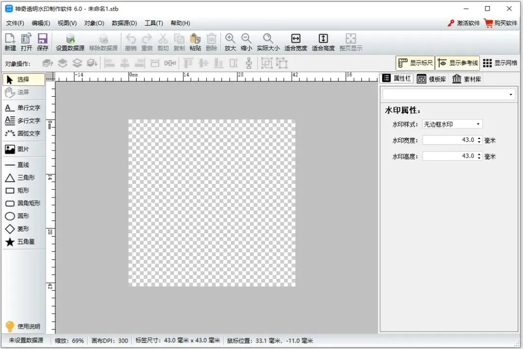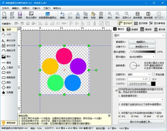 神奇透明水印制作软件是由生气像素推出的一款非常专业的logo设计、透明图片生成应用,支持多种透明水印效果制作,提供了各种对象元素,如文字、图片、图形、圆弧文字等,用户可以任意使用、任意设计,轻松快速设计出专业的logo图片或透明图片,并且还支持导入Excel、Access、SQLite文件等多种数据库,支持用户对数据源进行管理或分割筛选,还支持依数据源记录批量导出水印图片。