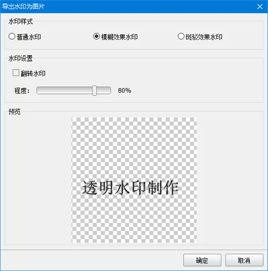 此外,神奇透明水印制作软件拥有普通、模糊效果和斑驳效果水印三种水印样式可以选择,logo透明图片的模糊效果、斑驳效果水印可精准控制其模糊、斑驳程度,生成透明图片导出前还支持翻转水印并预览生成效果,最后方便用户一键导出PNG透明格式图片。