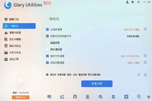 1、下载安装Glary Utilities,点击一键优化进行扫描硬盘,可看见扫描出的问题