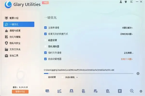 一键式维护将常用功能集成在一起。单击一次可清理垃圾文件、修复系统错误、清除隐私记录并优化计算机性能。