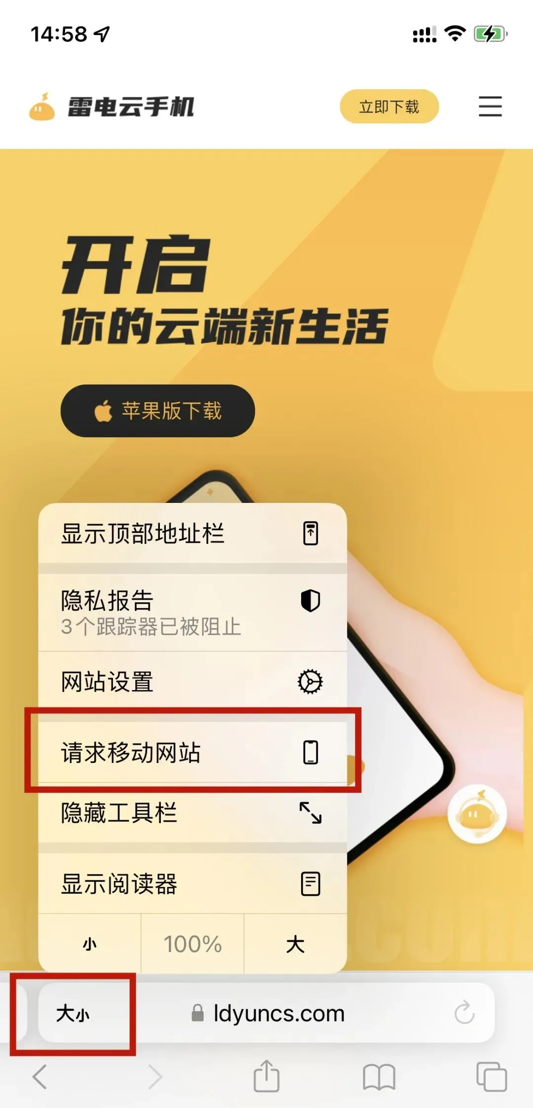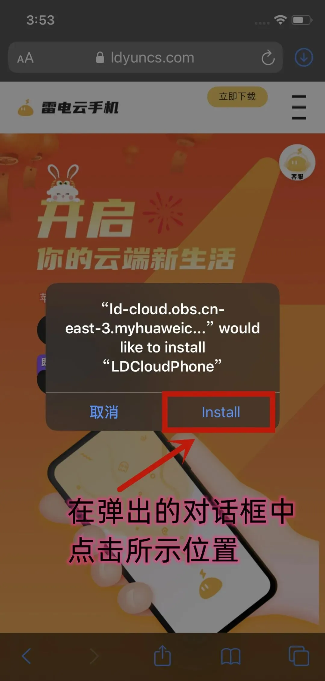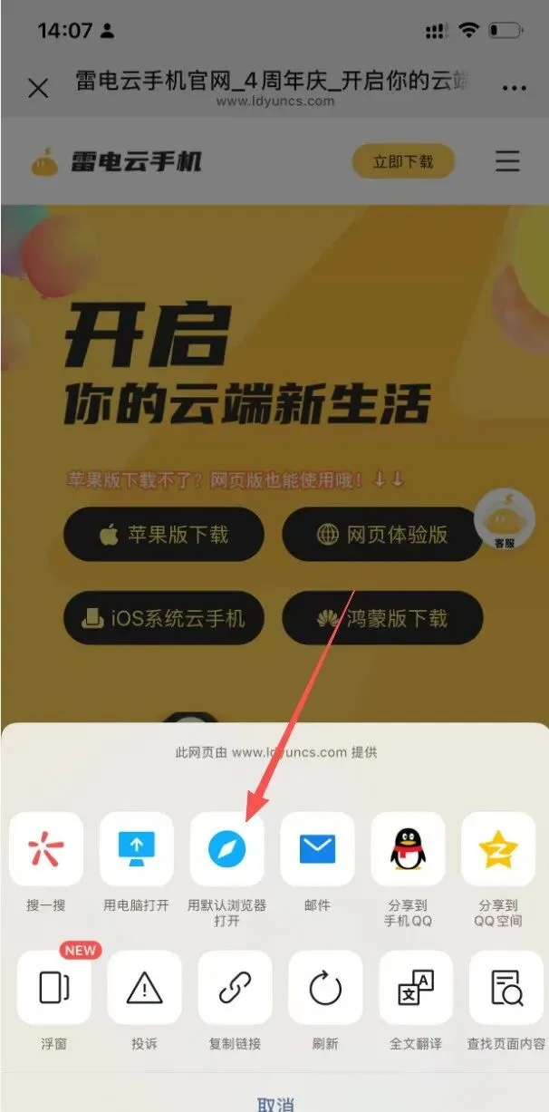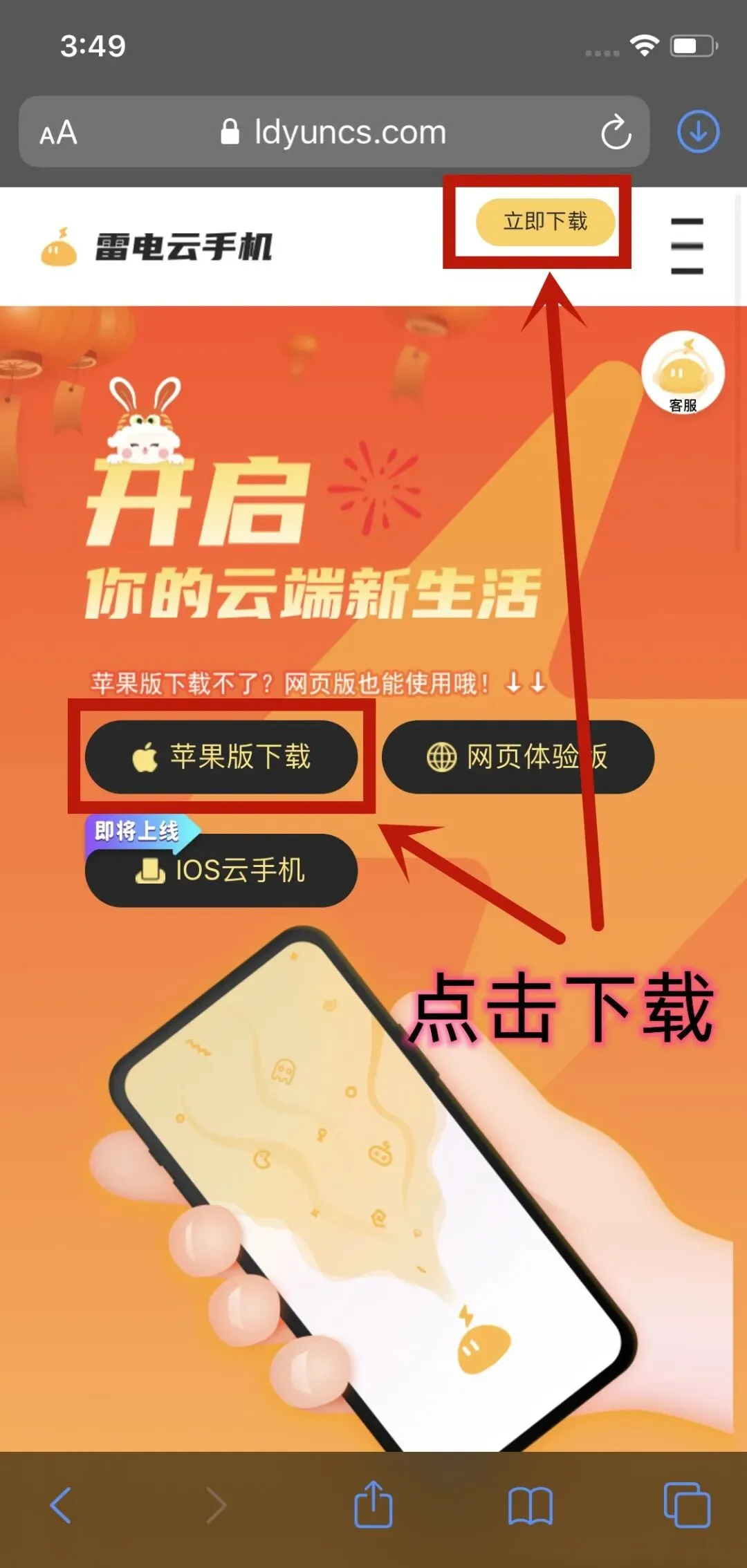 第一步,使用Safari浏览器打开雷电云手机官网www.ldyuncs.com,点击下载