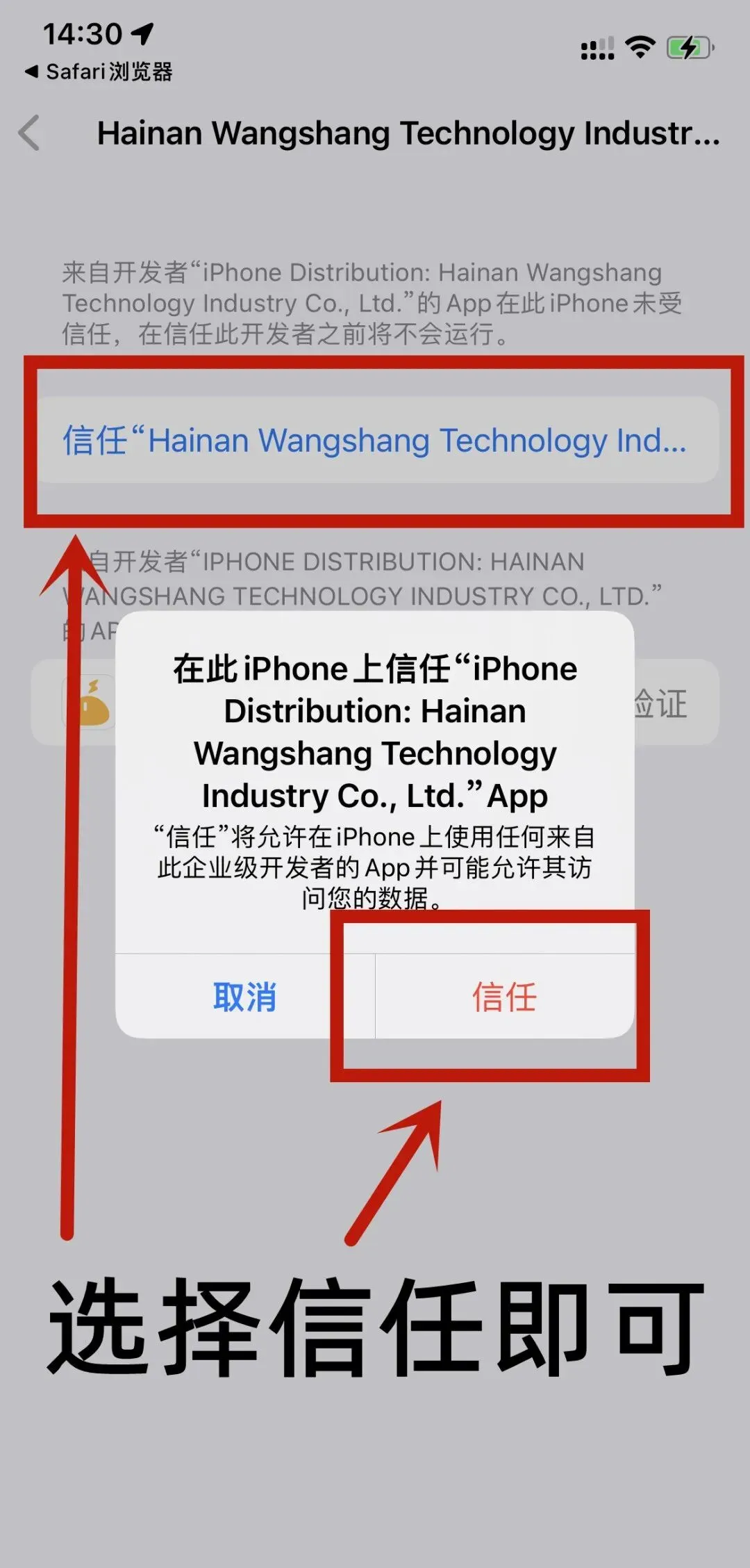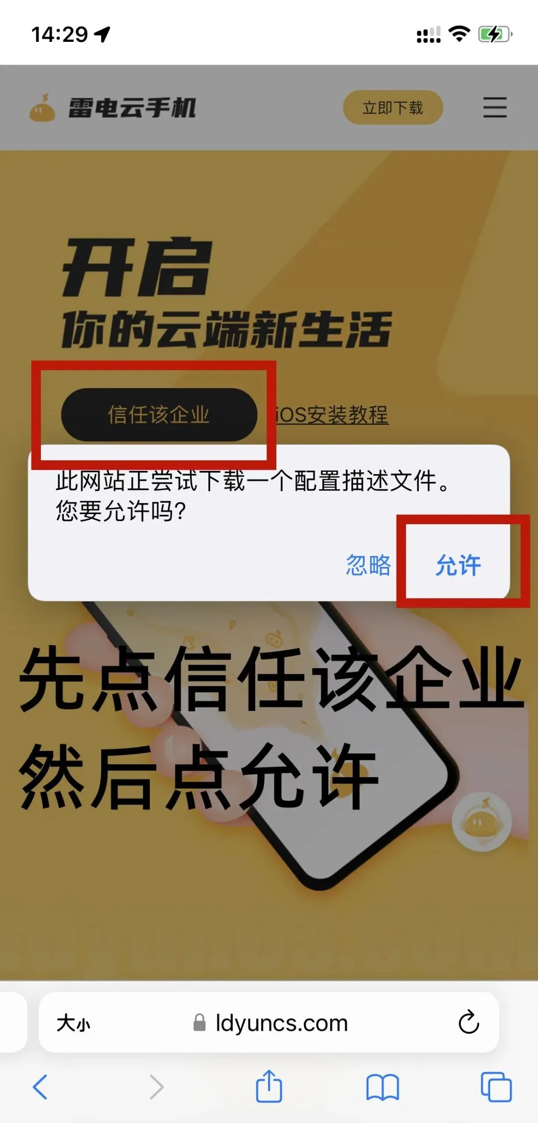 第二步,安装后选择信任该企业,此时网页会下载一个配置描述文件,选择允许(若没有,证明还没有安装成功)