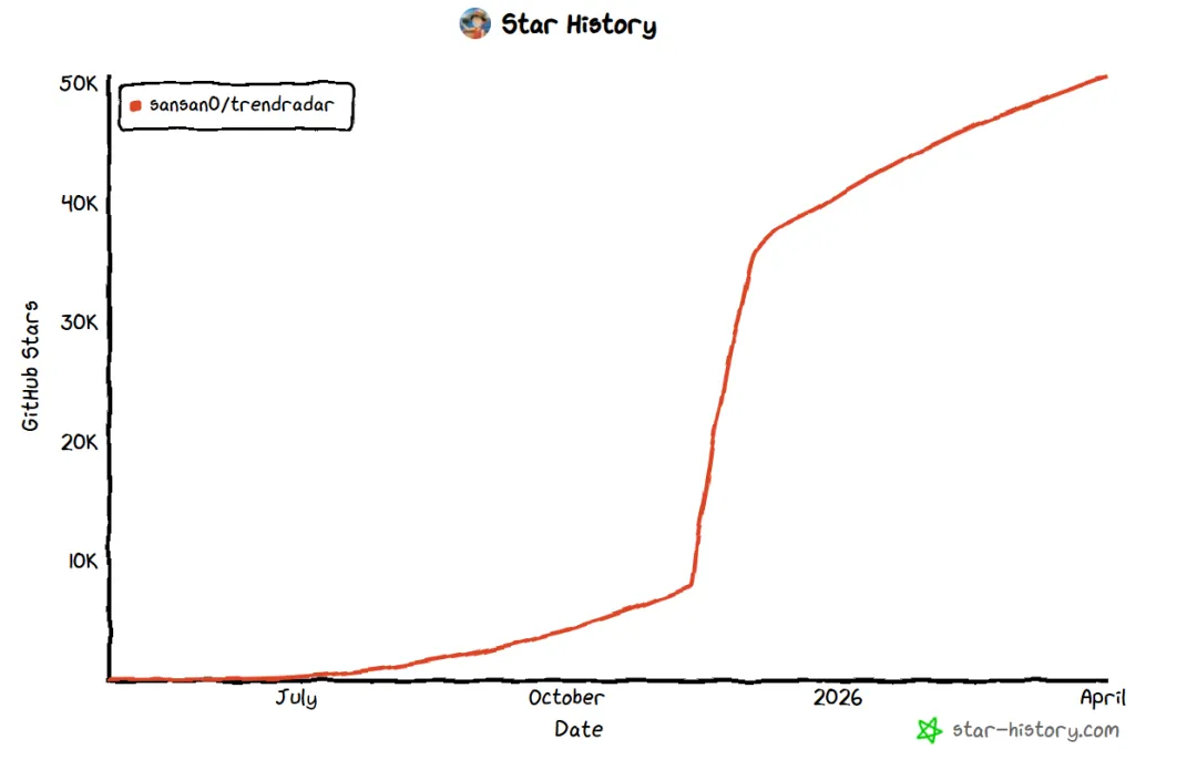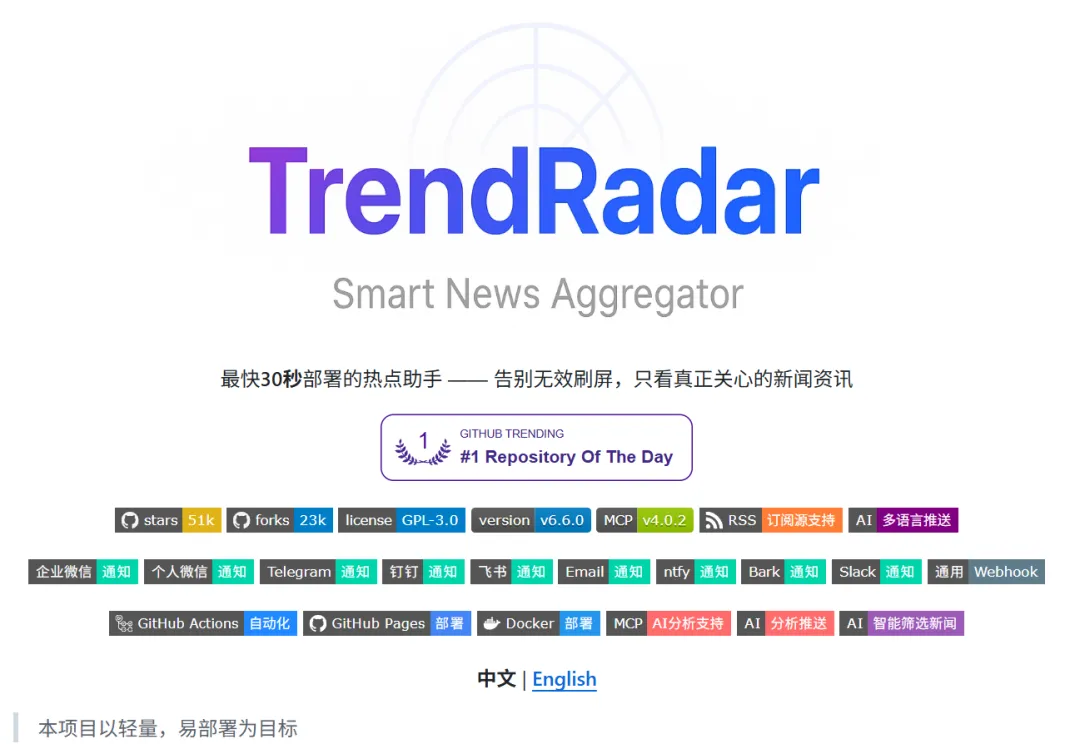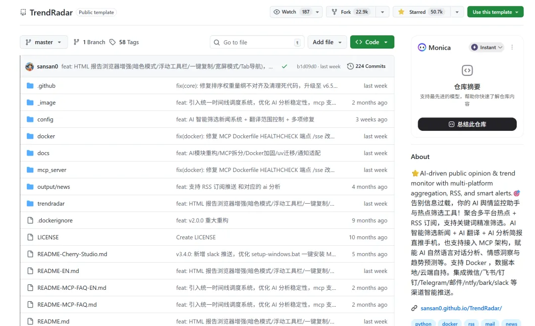 有。这个工具叫 TrendRadar,GitHub 上 50.7K Star,开箱即用,我部署完到现在跑了小半个月,体验很稳。