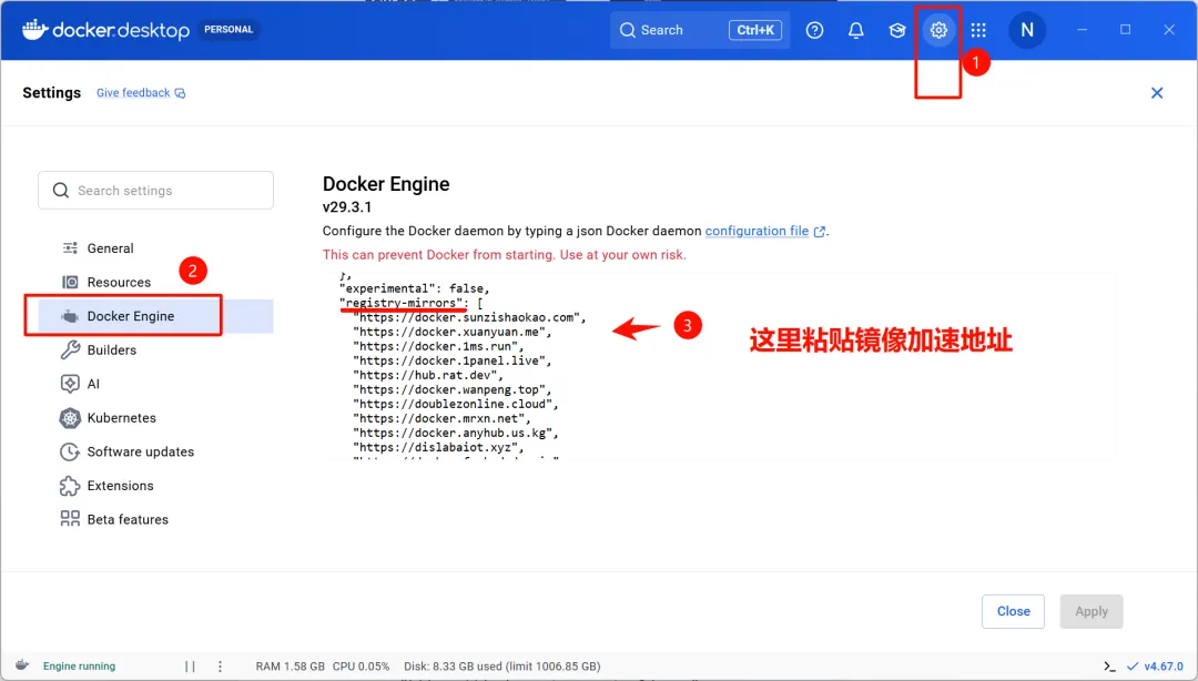 打开 Docker Desktop → Settings → Docker Engine,把下面这段粘进去,改完点 Apply: