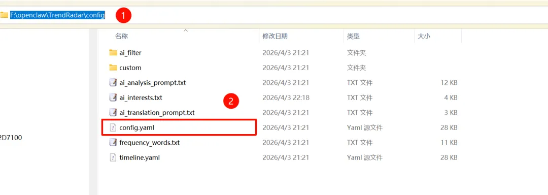 用 VS Code 或记事本打开 config/config.yaml,盯住这几个必改项: