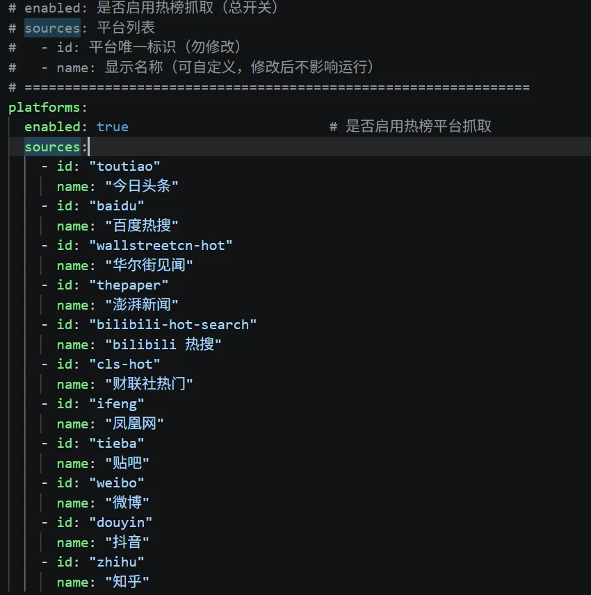 • platforms.sources:增减你想抓的平台,比如知乎、微博、抖音、B站