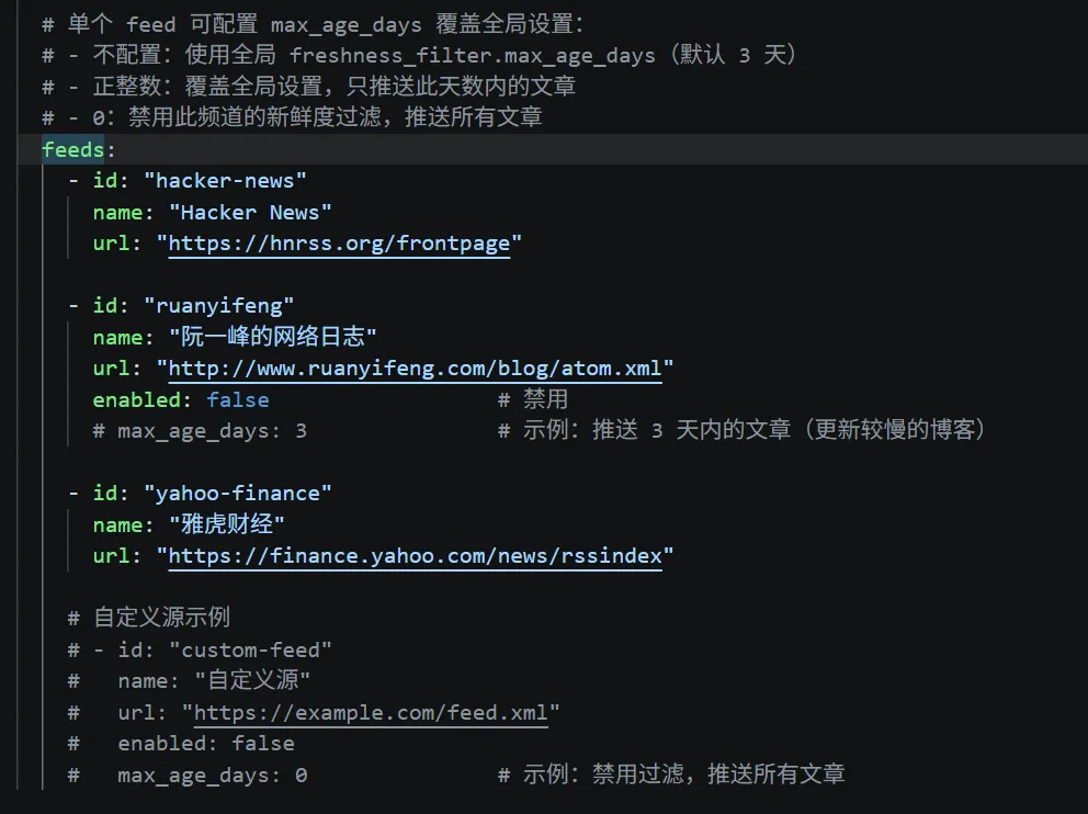 • rss.feeds:默认有 Hacker News等,想加其他源直接往里填 RSS 地址,不想要的,删掉即可