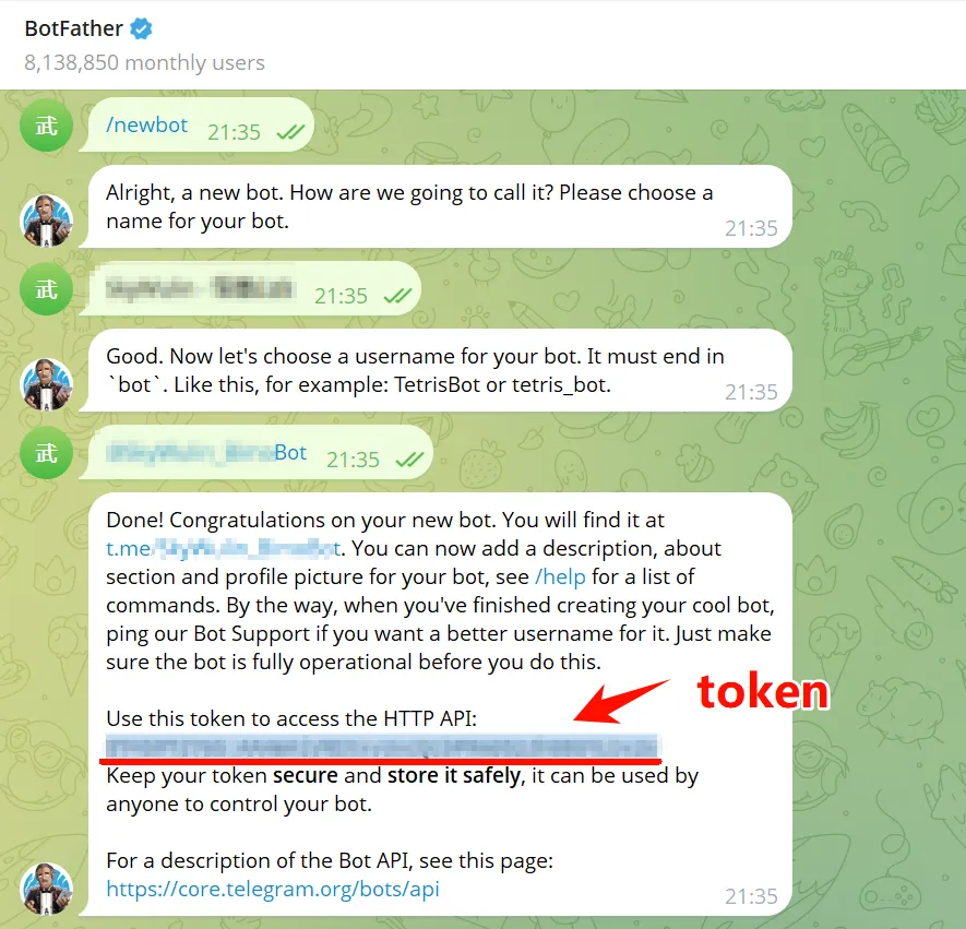 @BotFather会回复一条包含API Token(格式如1234567890:ABCdefGHIJKLMNOPQRSTUVWXYZ...)的消息,将其复制下来,这就是你的TELEGRAM_BOT_TOKEN